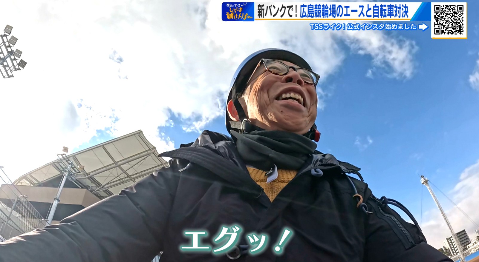 ということで、ふたりはミニベロタイプの自転車に乗って広島競輪場のエースと真新しいバンクで自転車対決です。