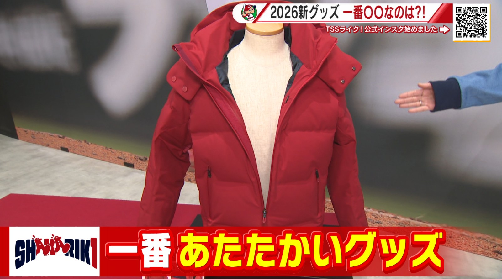 「まずはこちら。1番暖かそうなグッズ。冬といえば、ダウンですよ。真っ赤なダウンの内側は、カープのロゴの総柄となっています。オープン戦の時期もまだまだ寒いですから、これをきて観戦したいですね。」。