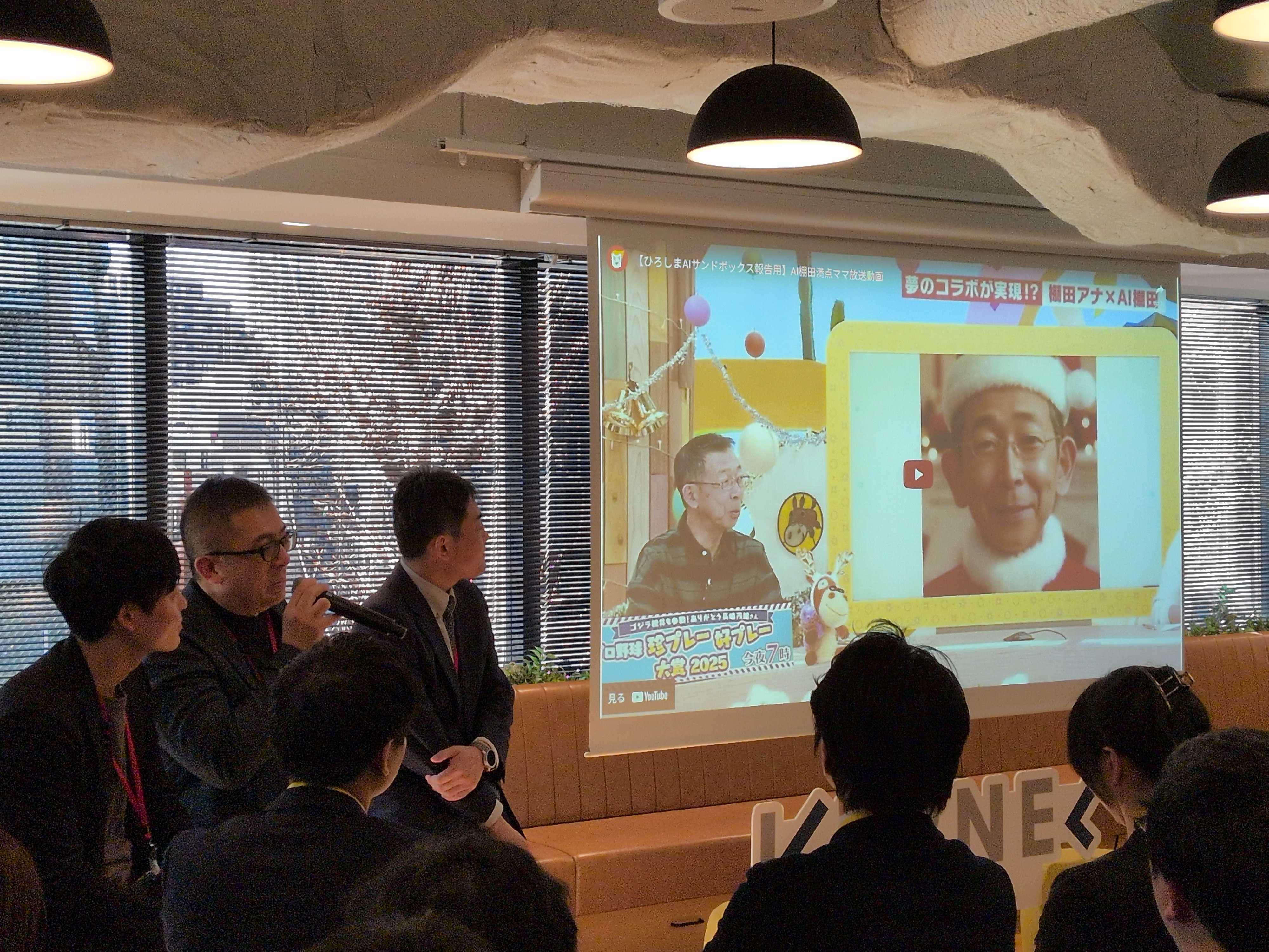 2025年度は、250件を超える提案の中から19のプロジェクトが採択されました。当日は、報道機関のノウハウを学習させたAIインタビュアーをLighthouse社と協業して開発したテレビ新広島と、事業承継・M&A支援のAIプロダクトを開発したwhyme社が登壇し、今年度の実証内容を紹介しました。