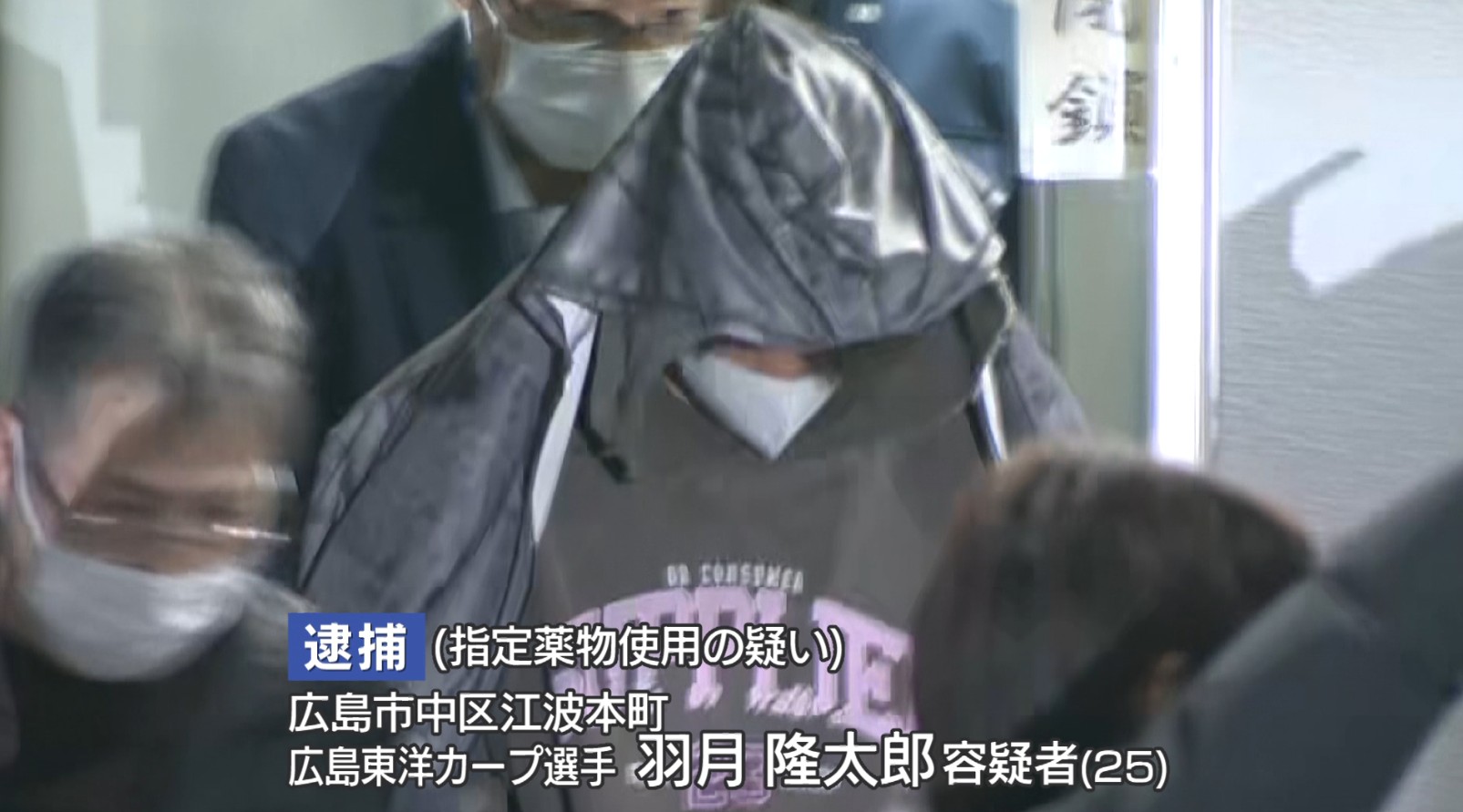 警察によりますと、広島カープの選手、羽月隆太郎容疑者(25)は去年12月半ばごろ、日本国内で、「ゾンビたばこ」と呼ばれる指定薬物、「エトミデート」を若干量摂取して使用した疑いがもたれています。