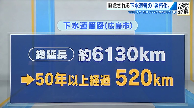 広島市内の下水道管路は総延長およそ6130kmあり、そのうち設置して50年以上経過したものが520kmあるそうなんです。