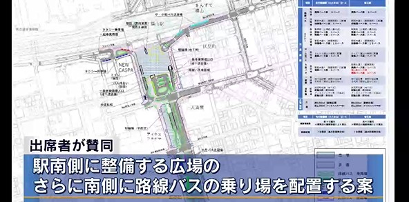 出席者からは駅南側に整備する広場のさらに南側に路線バスの乗り場を配置する案や、それに加え、駅の北側に路線バスを除く観光や送迎バスなどの乗り場を集約する案を支持する声が相次ぎました。
