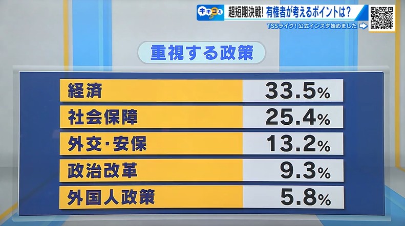 続いて、投票先を決める際の重視する政策では、「物価高対策など経済政策」、「年金や医療など社会保障政策」「外交や安全保障政策」が上位を占めています。