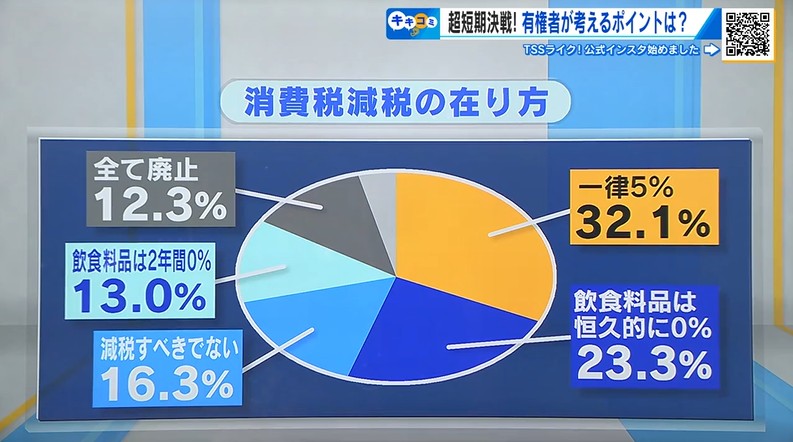 今回の選挙の争点の1つとなっている”消費税減税”の在り方については、最も多かったのが「一律5%にする」、続いて「飲食料品は恒久的に0%」が続きましたが、「消費税を減税すべきでない」が3番目に多い結果となりました。
