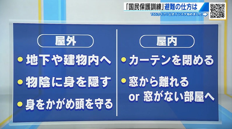 訓練は、他国から発射されたミサイルがコースを外れ、県内へ落下する恐れが生じたという想定で、参加者らは、身をかがめて頭を守ることなど、避難の手順を確認していました。