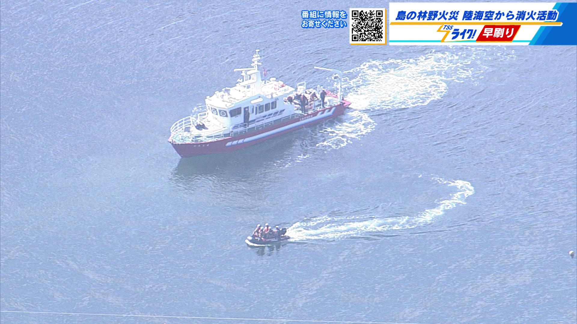 消防隊員らは救助艇で現場へと向かい、ポンプやホースなど機材を持ち込んで消火活動にあたりました。