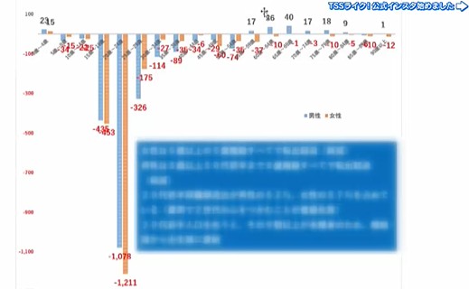 「20歳から24歳が圧倒的に減っている。男性は52%が20代前半に集中している。女性に関してはさらに角度がついて57%が20代前半に集中している」