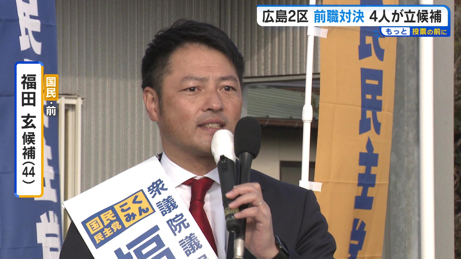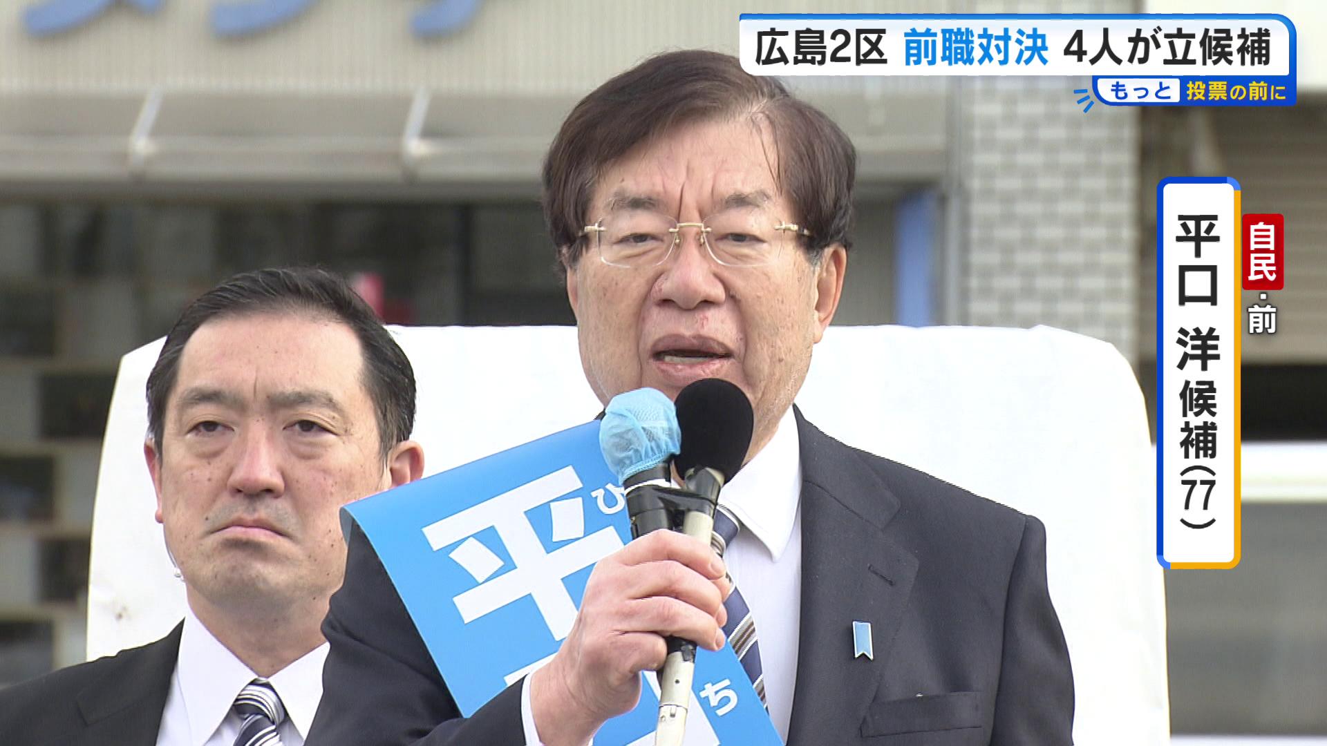 広島2区です。高市政権で初入閣したベテラン自民・前職に、前回衆院選で敗れたものの比例で復活当選した前職と新人2人が挑みます。