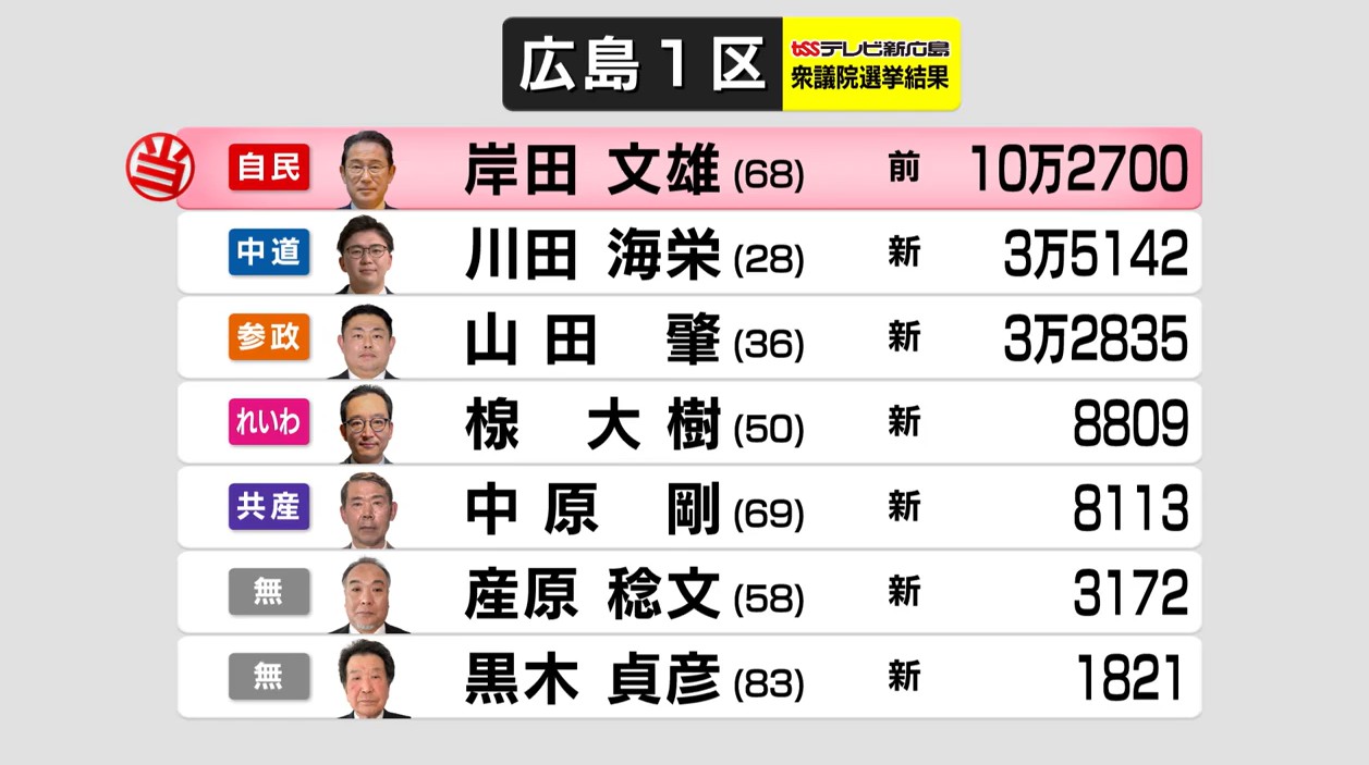 広島1区は元総理大臣で自民党・前職の岸田文雄さんが大差で当選しました。