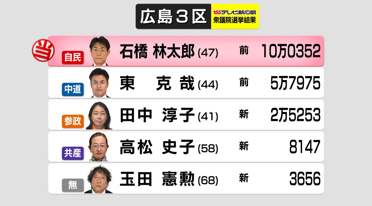 広島3区は自民党・前職の石橋林太郎さんが、自公連立解消で初めて小選挙区に挑み、当選しました。