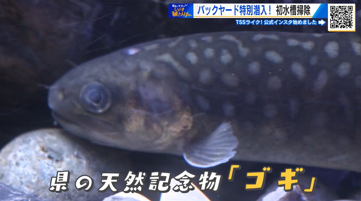 谷を流れる『渓流』をイメージして作られたこの水槽では、広島県の天然記念物で絶滅の危機にある『ゴギ』を見ることができます。