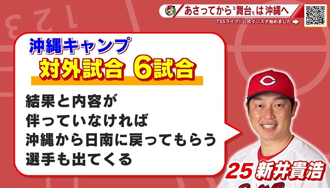 そしてあさって14日から始まる沖縄キャンプでは対外試合6試合が予定されていますが、新井監督は「結果と内容が伴っていなければ沖縄から日南に戻ってもらう選手も出てくる」と2次キャンプでは異例の選手入れ替えの可能性も示唆しました。