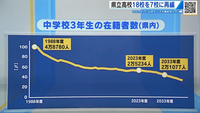 少子化の影響を受けて県教委は、2033年度時点で「1学年4学級」を下回る見込みの都市部の県立高校を再編する方針を示しています。
