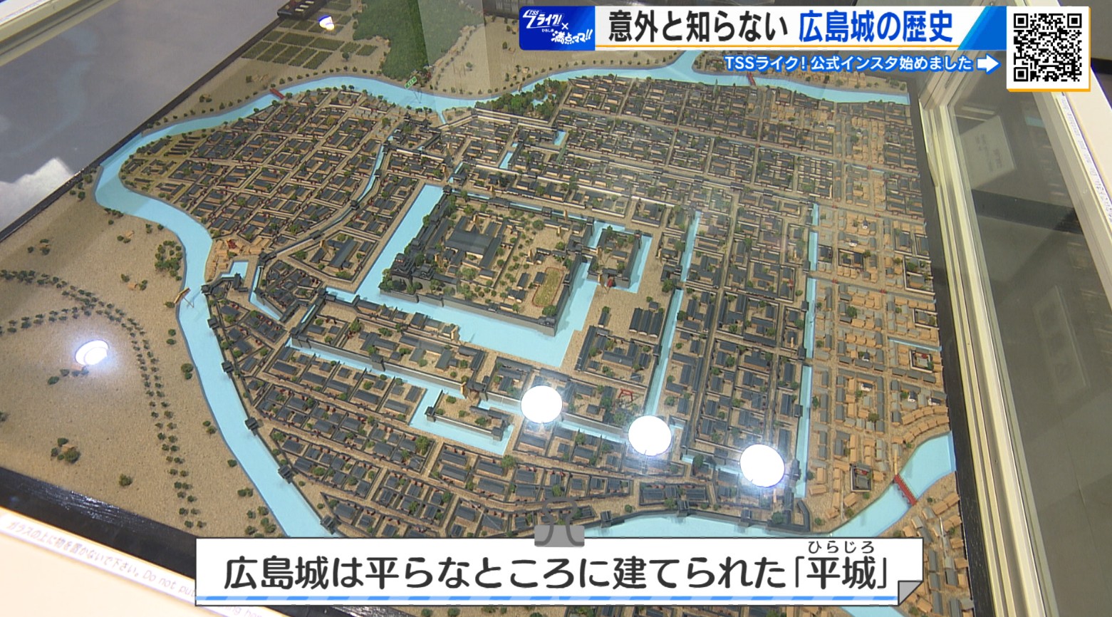 「ちょっとこちらの模型の方に来ていただけませんでしょうか。こちらがですね、江戸時代の広島城と、広島の城下町の模型になっておりまして、ここが、今私たちがいる天守になります。実は江戸時代の天守っていうのは、2つほど小さな天守がドッキングしておりまして、かなり立派な造りになっております」