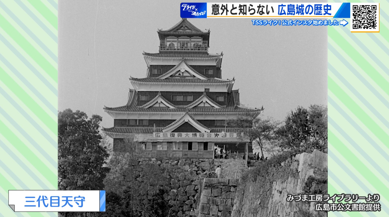 「戦後、天守が一瞬復活するときがあります。昭和26年に今でいう国民スポーツ大会、当時は国民体育大会と言ってたはずですが、それが広島で開かれまして、その関連イベントでで『体育文化博覧会』というイベントが開かれることになったんですが、そのシンボルタワーとしてですね、天守が復元されたんです」