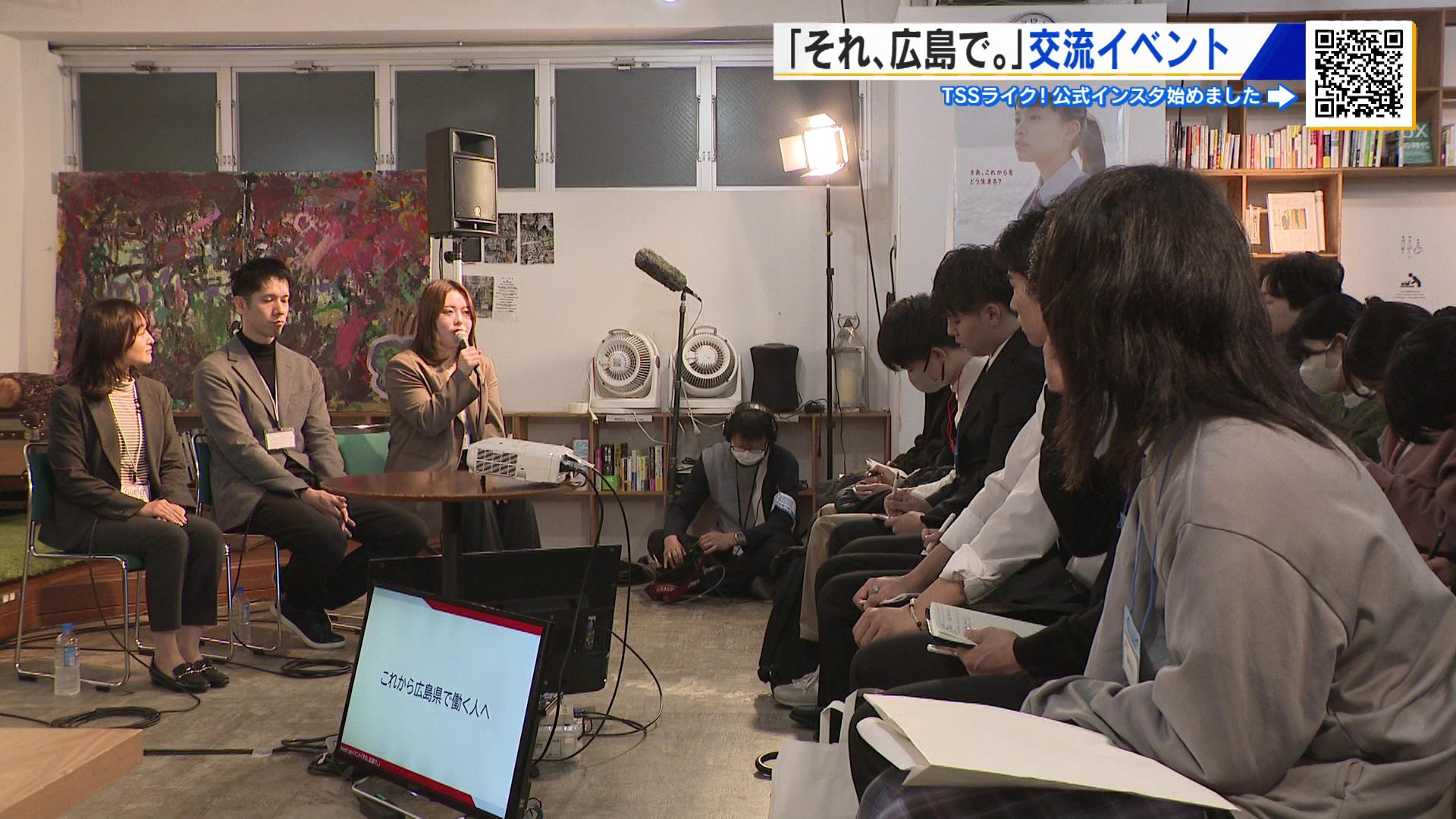 広島市内で行われたイベントは、「広島で働くこと・暮らすこと」への関心を高めようと開かれたもので、UターンやIターンなど様々な形で広島で働く若い世代が体験を伝えました。オンライン配信も行い、県内外の学生などが耳を傾けました。