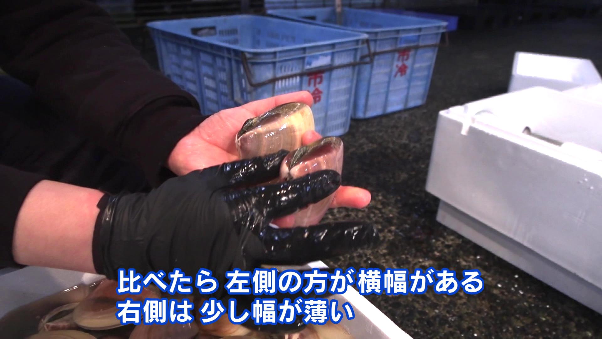 「(ハマグリの)おしりを見てぷっくりと横に張っているもの。比べたら左側の方が横幅がある右側は少し幅がうすい。横幅がぷくっとして真ん中がふくれているものが中の身もふっくらとしていていいです」