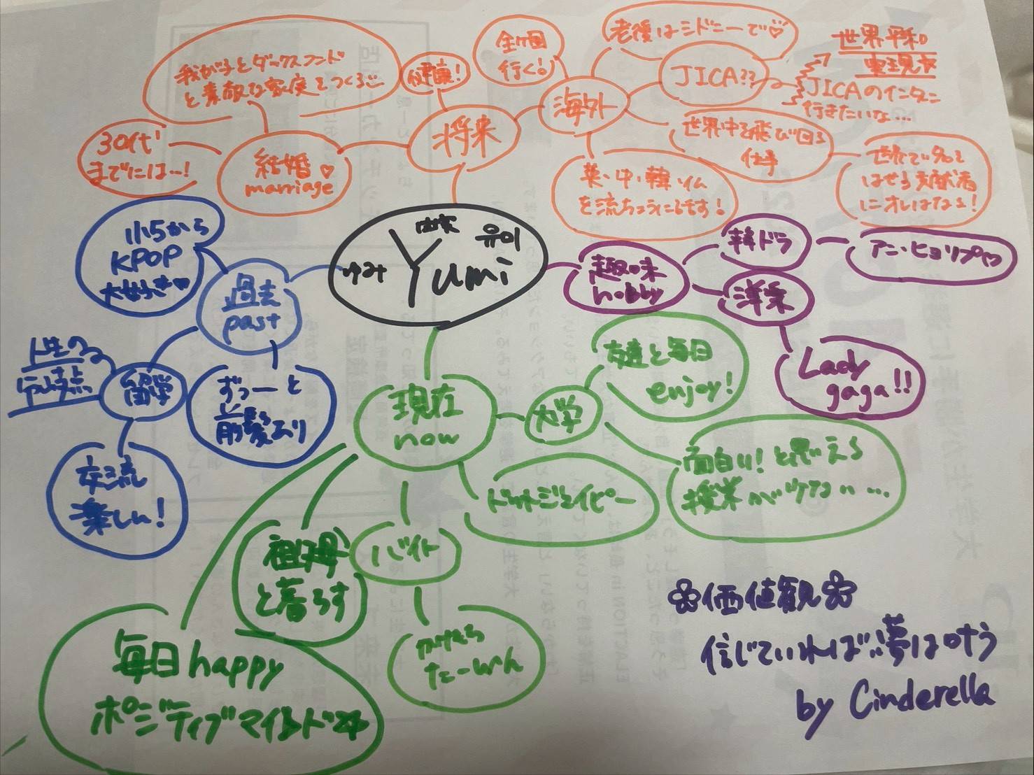 参加者は自分の名前を中心に、過去・現在・未来のビジョンや趣味、価値観を書き込み、共有し合うことで、言語や文化の違いを越えた相互理解を目指しました。