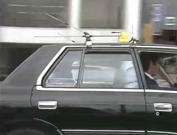 車用のテレビは、それまで市街地を走ると電波がビルで乱反射して映像が不鮮明になっていましたが、屋根に2本をセットする新しいタイプのアンテナがその欠点を解消。