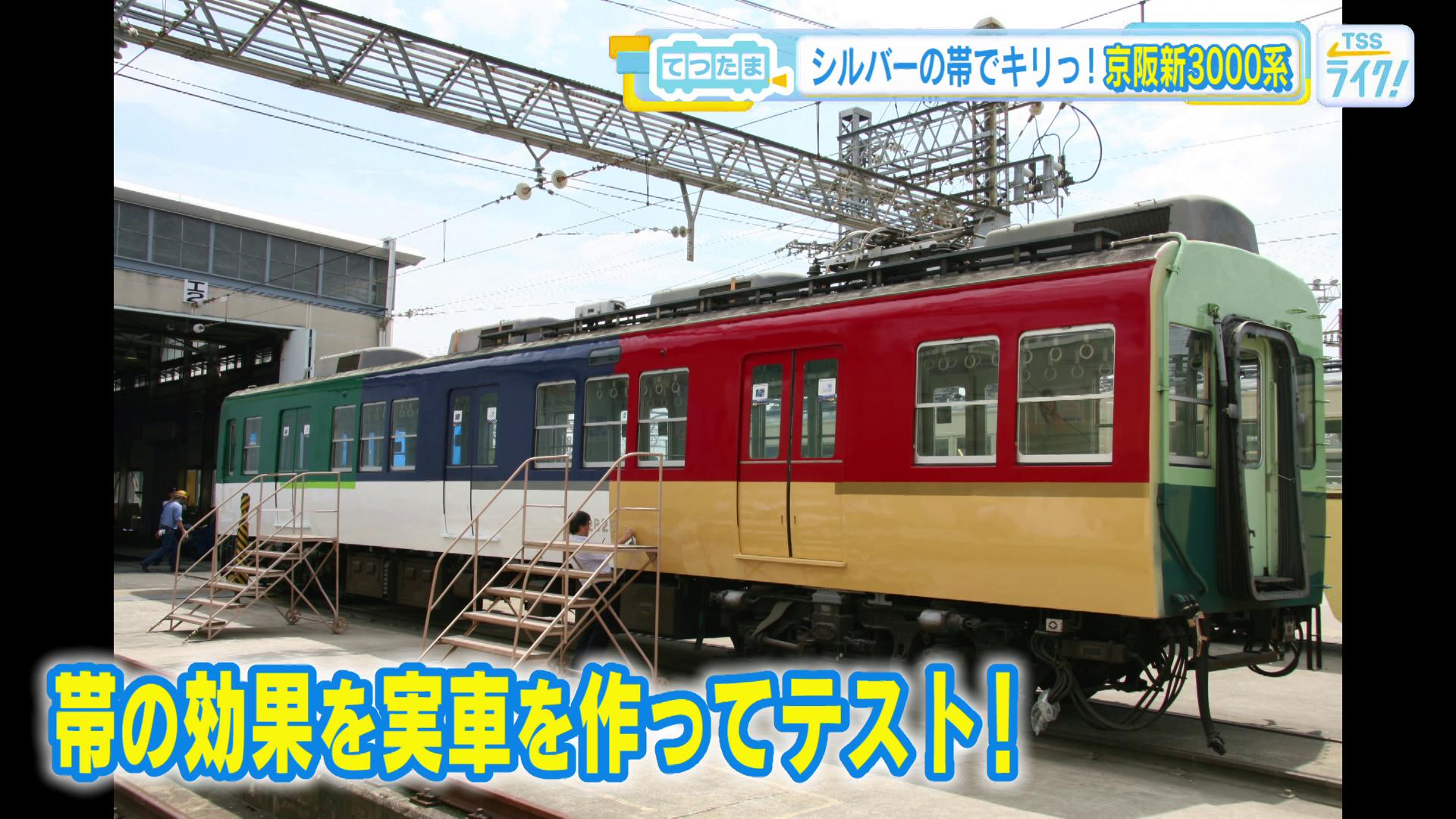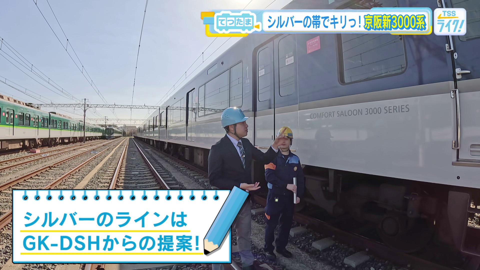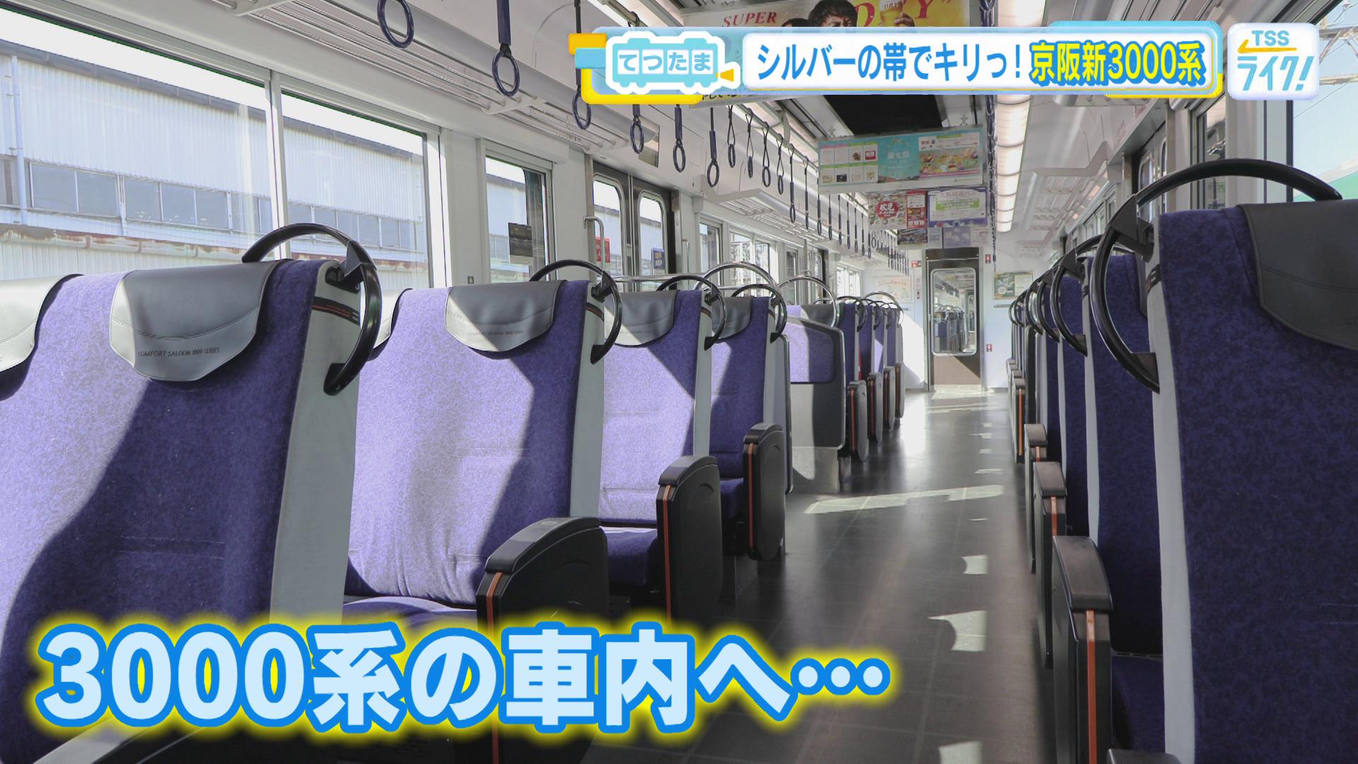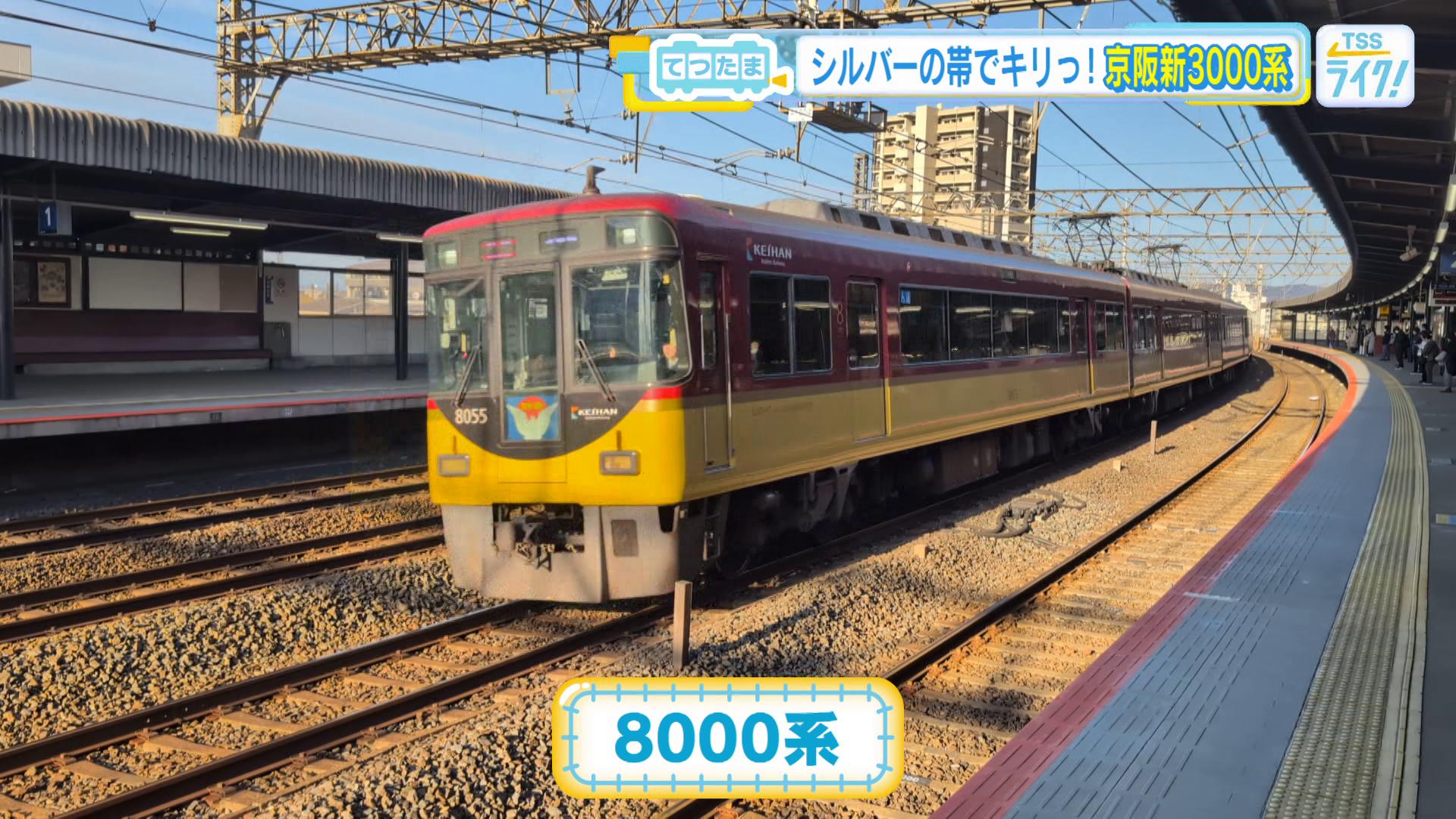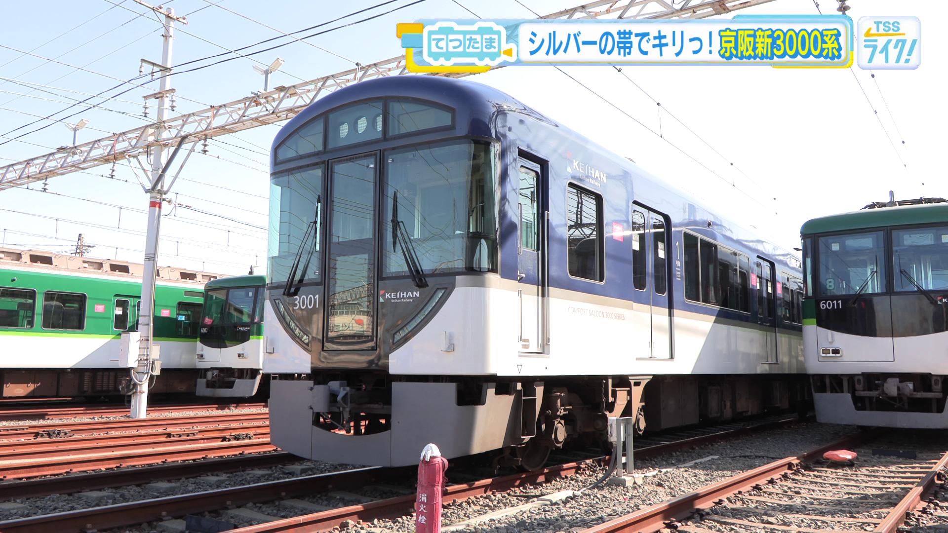 「おー!3000系でございます。『新3000系』という呼び方をすることもありますね。(対して)かつて特急の車両として活躍した3000系のことを旧3000系と。まず何といってもですね、西尾さん。もうカラーリングからして、今までの京阪の車両とは全然違いますね」