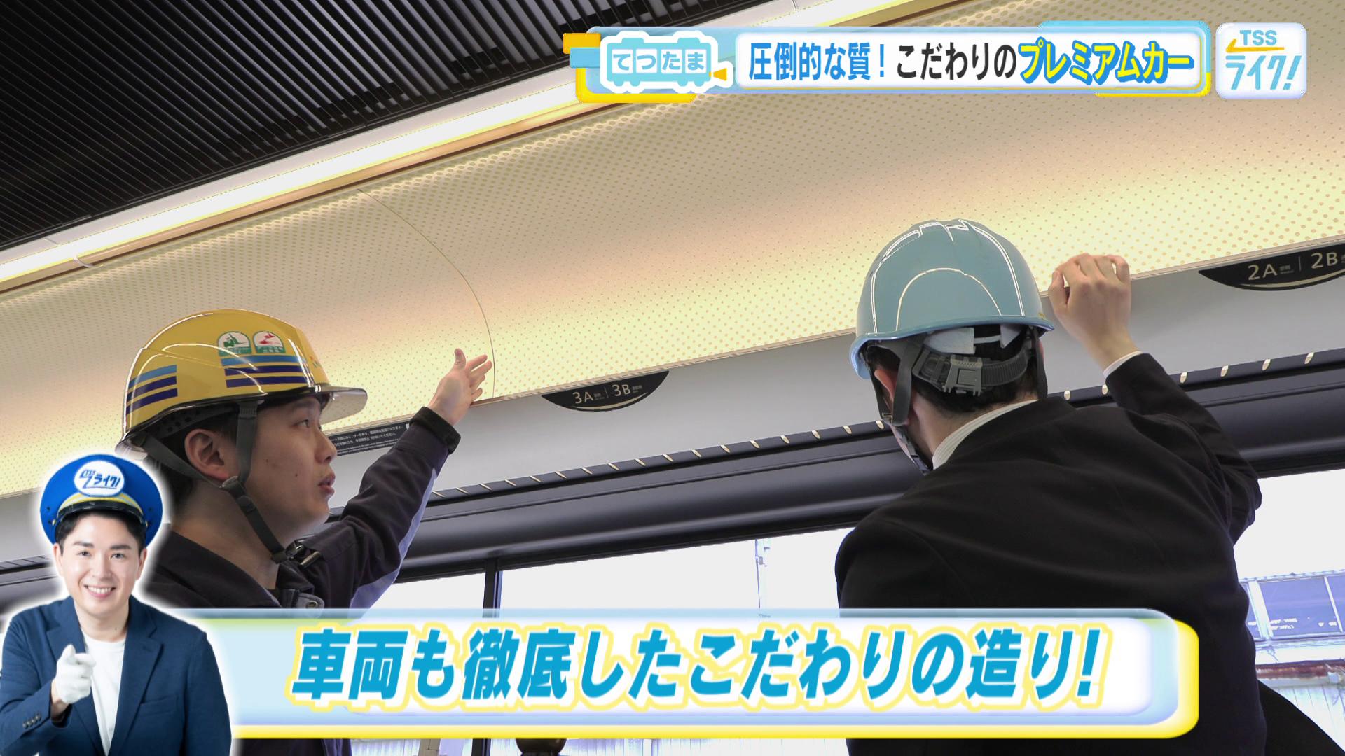 「そうなんです。もともと(運賃以外の)お金を頂いていない京阪電車なのでそこからお金をもらうというのはどういうことかというのは、社内でもたくさん議論しました。『圧倒的な質』。これを我々のコンセプトにして設計を進めました。ジャガード織という高級な織り方をしていまして、適度な弾力と滑り止め。高級感がある立体感と。あとはですね、鉄道車両はたくさんの方が使用されるので。なるべく劣化が少ない作りになっています。あまり気づいてもらえないんですけれども、例えばこの照明を見ていただくと、実は金色にアルマイト加工がされてるんですよ」