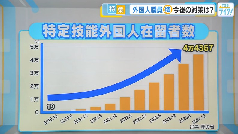 厚労省の調査では介護職における「特定技能外国人」は2019年に受け入れを始めてから、右肩上がりとなっていて2024年12月末にはおよそ4万4000人と過去最高を更新しています。