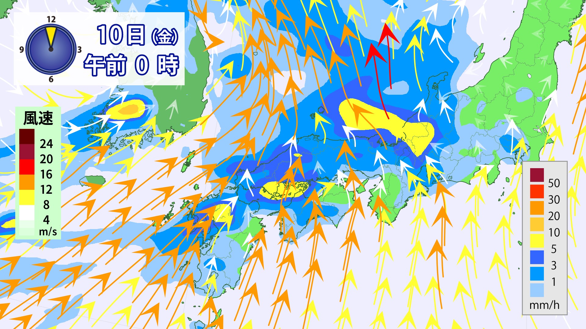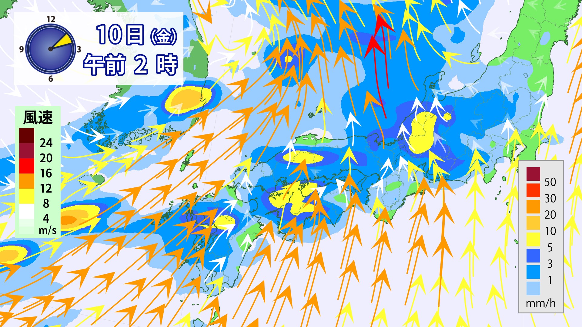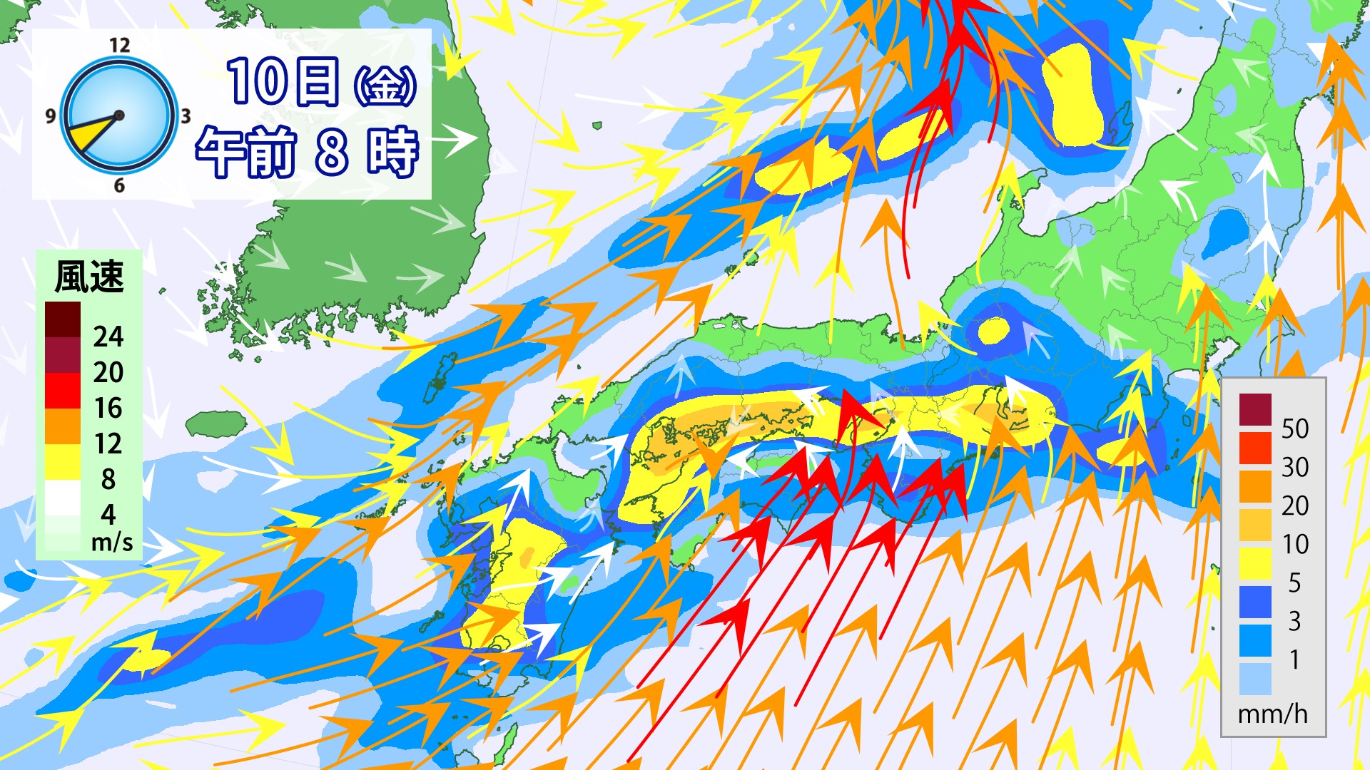 南部では、10日未明から朝にかけて、局地的に雷を伴った激しい雨が降る見込みです。雨雲が現在の予想以上に発達した場合には、警報級の大雨となる可能性があります。
