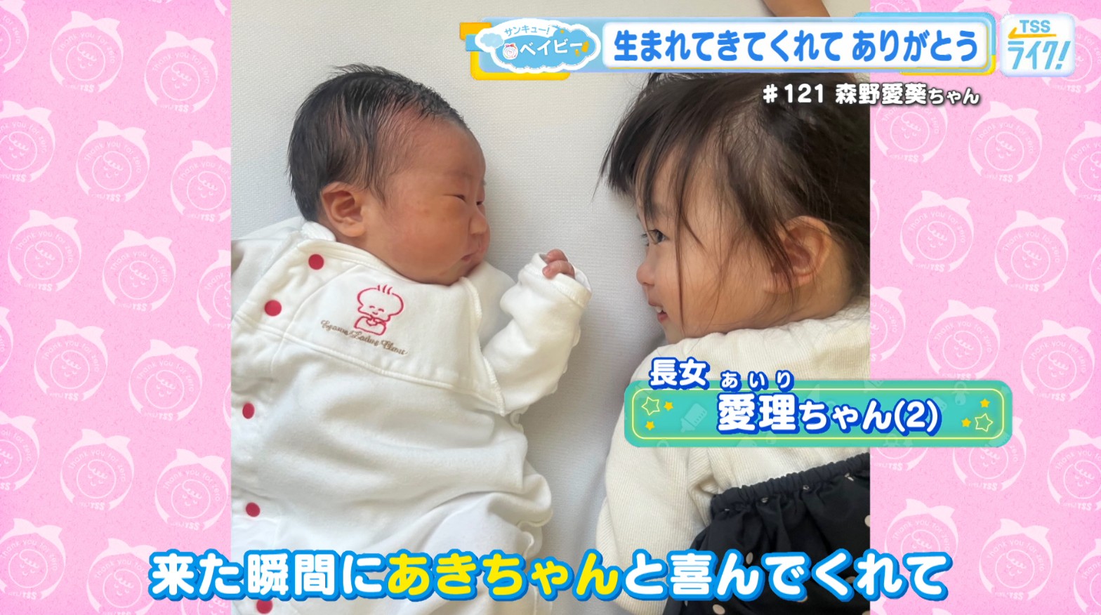(長女は)最初は嫉妬するかなという心配はあったんですけど、来た瞬間にあきちゃんあきちゃんって言って、喜んでくれて。ミルクあげてくれたり抱っこしてくれたり、すごく可愛がってくれています。どんな時も明るく芯のある子に育ってほしいなっていうのとお姉ちゃんと仲良く二人で助け合いながら、家族みんなで楽しく過ごしていけたらなと思います」