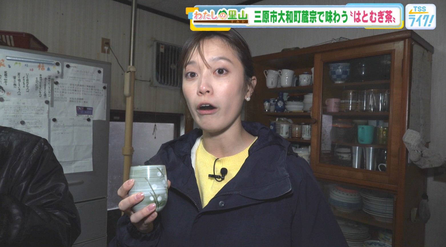 (辰已アナ湯呑を受け取って)「もう一回!ありがとうございます」