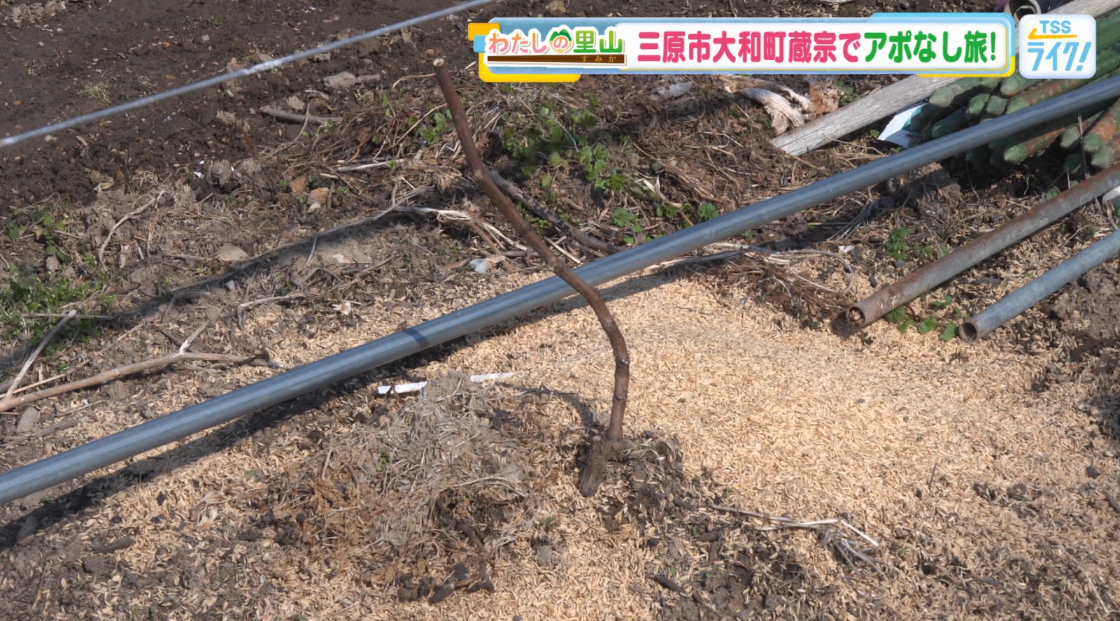 「そうです!ワインのブドウをつくる時と同じような作り方で、マンズ・レインカットっていうんですけど、春からはカバーをつけて屋根ができるんですけど、ここくらいに実ができるんです。こことかこことか結構下のほうに」