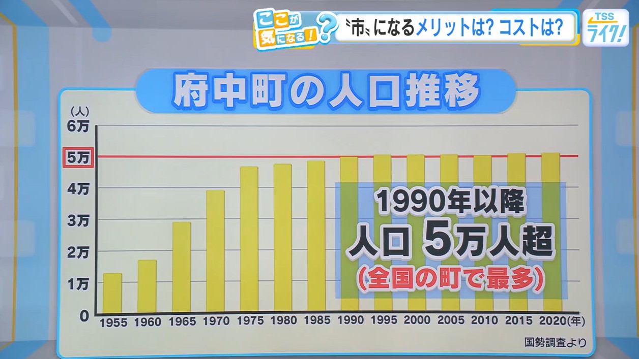 府中町は1990年以降30年の間、人口5万人以上を維持し、『全国で最多の町』です。