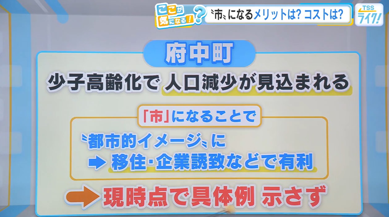 一方で、今後は少子高齢化が進み、現状のままでは人口減少が見込まれるとして、「市」になることで都市的なイメージをアップさせ、移住や企業の誘致で有利になるとしていますが、現時点で、具体例などは示されていません。