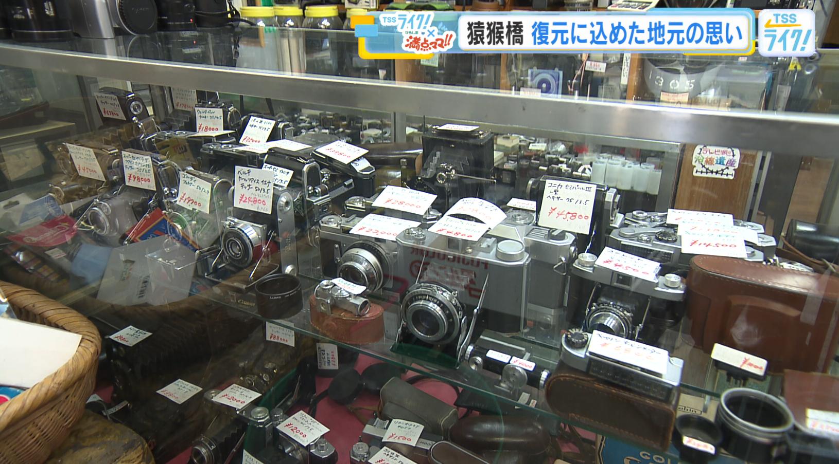 「さあ、続いても猿猴橋の歴史をよく知るお店、こちらです。伺ってみたいと思います。お邪魔します。こんにちは。わぁ、すごいたくさんのカメラがありますね。ご主人」