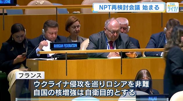 その後、締約国が立場や現状認識を示す一般討論演説が始まり、核保有国のフランスは、ロシアによるウクライナ侵攻を非難し、一方で自国の核増強については自営目的としました。