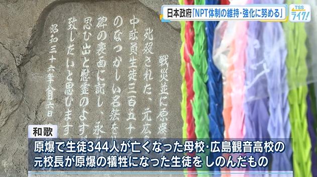 原爆の惨禍で生徒344人が亡くなった広島観音高校の当時の校長が生徒を偲んだもので、核兵器による死と苦しみをたとえ一人たりとも許してはならないと訴えました。
