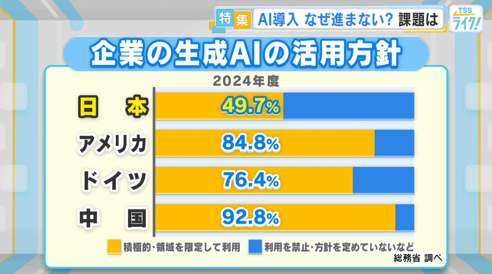 総務省によると、生成AIの活用を「積極的」または「領域を限定して」活用したいと回答した企業は全体の5割にとどまり、8割以上のアメリカや9割を越える中国に比べて、低い水準です。