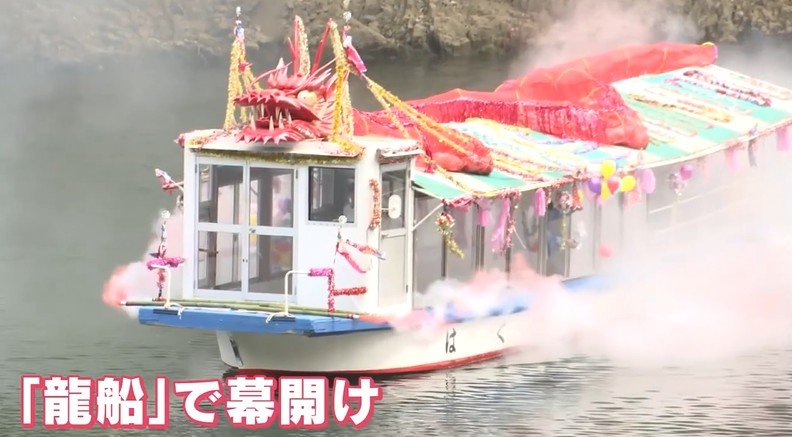 龍の飾りを付けた長さおよそ15メートルの遊覧船「龍船」2隻が登場し、煙を上げながら観光シーズンの幕開けを祝いました。