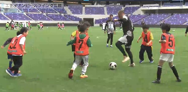 後半のサッカー教室では、サンフレッチェ広島アンバサダーの森崎浩司さんも参加し、ドリブルやリフティングでボールと触れ合いました。