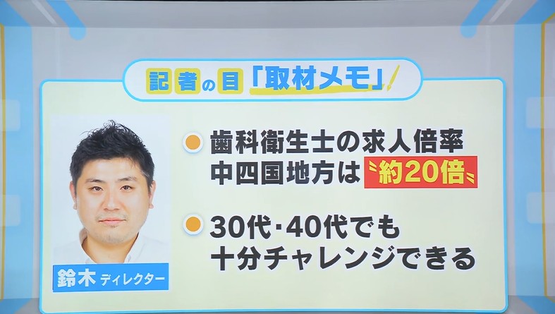 人生100年時代と言われる中で健康寿命の延伸に重要な役割を担う歯科衛生士の方々ですが、歯科衛生士の求人倍率も中四国地方ではおよそ20倍と極めて高くなっているということです。