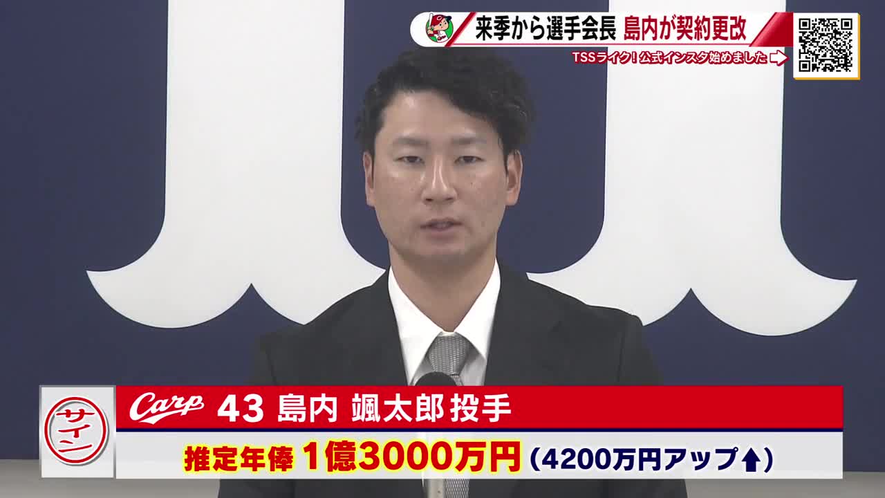 カープ 島内投手 1億3千万円でサイン 来季は選手会長「勝ちに向かって全員でやっていく!」