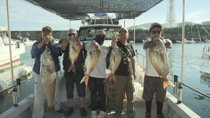 向かったポイントは愛媛県の最西端、日本一細長い半島として知られる佐田岬半島の沖合。瀬戸内海と宇和海、さらに豊後水道が交わる地点で、潮の流れが速いのが特徴です。タイラバでのマダイはもちろんですが、ハマチやブリなどの回遊魚、根魚の魚影も濃く全国屈指の一級ポイント。この日は天候にも恵まれ、ベタ凪の海。出船さえ出来れば期待感であふれるこの場所。この日も序盤からマダイが連発し、70cmオーバーの大型も!そして、それを更に上回る大物を予感させる重量感のある引き。船上全員の視線をあびながら、海面に姿を現したのは…?