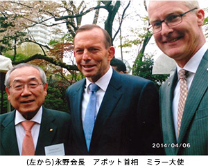 オーストラリアのアボット首相が初来日し、経済や安全保障などを安倍首相と会談しました。アボット首相は会談や面会など多忙なスケジュールを縫って、東京の在日オーストラリア大使館の庭で昼食パーティーを主催。そこへ、日本各地の日豪協会会長のひとりとして招待された永野正雄会長は、多くの招待者がある中、ミラー大使から声をかけられアボット首相を紹介されました。