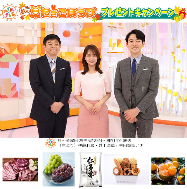 ◆実施期間◆第1弾 10月20日(月)~10月24日(金) 第2弾 10月27日(月)~10月31日(金) 秋の訪れを感じる季節。TSSでは、朝の時間をもっと楽しんでいただけるように“早起き応援キャンペーン”を実施します。 早起きしたあなたに、ちょっとうれしいごほうびを。 毎朝「めざましテレビ」で発表される “番号”に電話すると抽選で秋の味覚やスポーツ観戦チケットなど、うれしいプレゼントが当たります 特設ページはこちらから